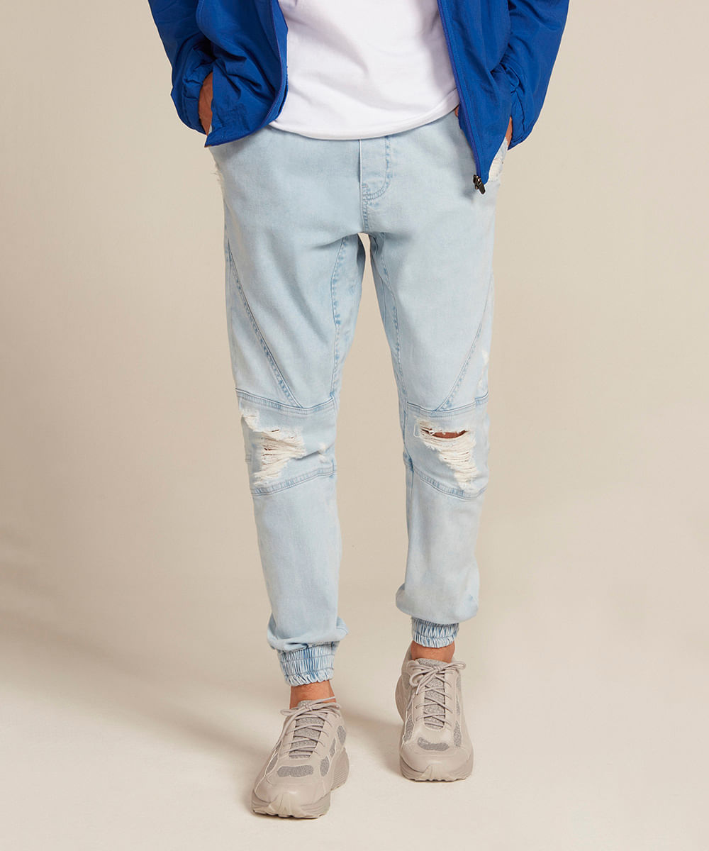 Calça Jeans Masculina Jogger Destroyed Azul Claro