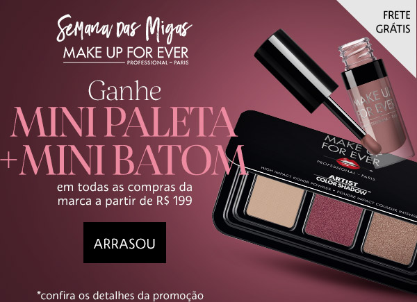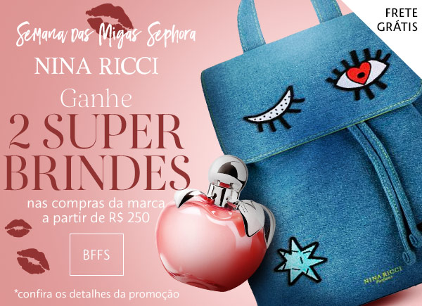 | Regulamento " Semana das Migas" *as opções de miniaturas para serem escolhidas como brindes aparecerão na sacola de compras / o valor mínimo de compra é de R$230 / válido apenas para a categoria Maquiagem / somente online / estoques limitados / imagem meramente ilustrativa / promoção válida até as 7 AM do dia 16.07.2019 ou enquanto durarem os estoques Regulamento "Descontinho das Migas" *desconto válido para produtos selecionados / desconto válido por tempo limitado / somente online / estoques limitados / imagem meramente ilustrativa / promoção válida até as 7 AM do dia 16.07.2019 ou enquanto durarem os estoque Regulamento "Especial Nina Ricci" *os brindes serão confirmados na sacola de compras / somente online / imagem meramente ilustrativa / promoção válida até as 7 AM do dia 16.07.2019 ou enquanto durarem os estoques / Válido para as compras da marca Nina Ricci a partir de R$250 Regulamento "Especial Make Up For Ever" *os brindes serão confirmados na sacola de compras / somente online / imagem meramente ilustrativa / promoção válida até as 7 AM do dia 16.07.2019 ou enquanto durarem os estoques / Válido para as compras da marca Make Up For Ever a partir de R$199 Regulamento "Hot Now" *somente online/ estoques limitados Promoções com brindes: Brindes com estoque limitado O brinde será visualizado na página do produto e/ou em sua sacola de compras, somente enquanto a promoção estiver válida. Caso contrário, o brinde estará esgotado.