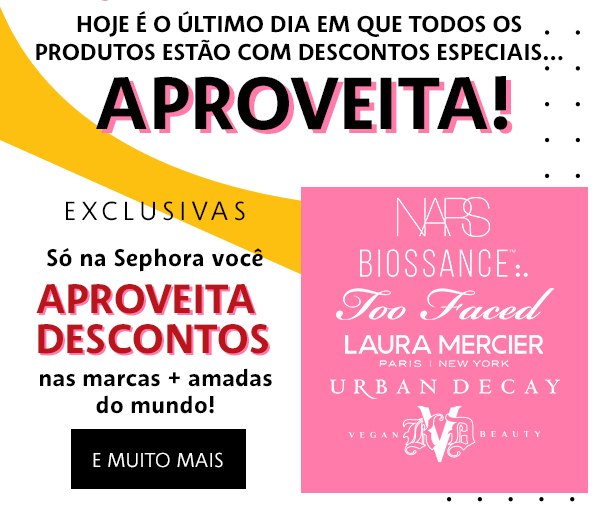 Regulamento | Aniversáro Sephora *somente online / promoção válida até as 7AM do dia 18.07.2020 ou enquanto durarem os estoques / descontos válidos em todo site da Sephora. Promoções com brindes: Brindes com estoque limitado O brinde será visualizado na página do produto e/ou em sua sacola de compras, somente enquanto a promoção estiver válida. Caso contrário, o brinde estará esgotado. Para garantir o recebimento de nossas ofertas e lançamentos, adicione o email news@a.sephora.com.br como remetente confiável.